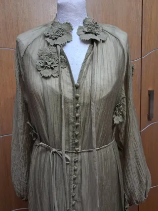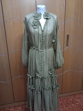 Vestido largo y fluido con un diseño elegante y detalles florales. - Tejido ligero con finas rayas verticales. - Cierre de botones en la parte delantera. - Cinturón fino para ajustar la cintura. - Adornos de flores aplicadas en el cuello, mangas y falda. - Falda con volantes y terminaciones rizadas.