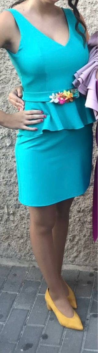 Elegante vestido azul con un cinturón de flores y plumas en la parte superior. Ideal para ocasiones especiales. - Diseño de corte recto. - Mangas tres cuartos. -Dos volantes en la cintura solo en la parte frontal. - Adorno floral en el cinturón.