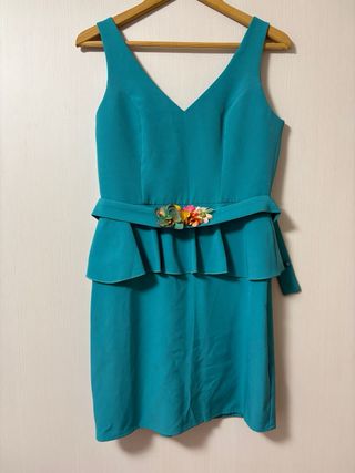 Elegante vestido de ceremonia con un detalle floral en la cintura. - Diseño con flores y plumas. - Cinturón adornado con pedrería y hojas. - Talla 44. -Marca Veneno en la piel - Necesita ir a tintorería porque fue usado en jardín y se ensució un poco los bajos.