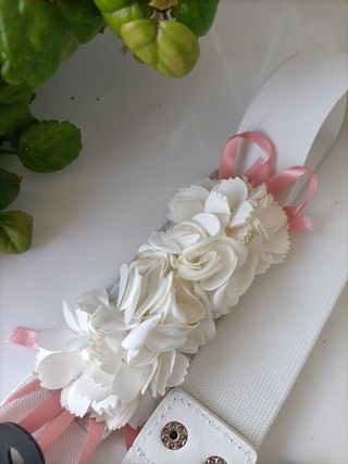 CINTURÓN ELÁSTICO color blanco con flores rosas. Talla única, válido para todas las tallas, desde la más pequeña hasta la más grande. Medidas: Largo: 70 sin estirar Largo: 122 estirado Ancho: 6 Lúcelo en una ocasión especial: bodas, bautizos, comuniones, fiestas, eventos...