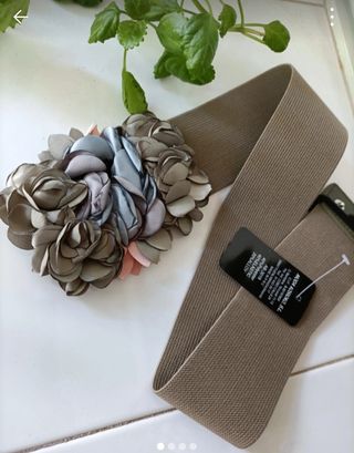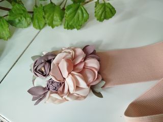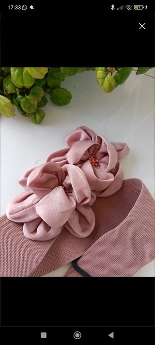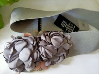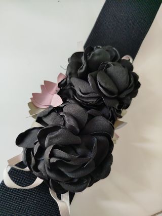 Elegante cinturón con detalle de flores en tonos grises y rosados, perfecto para complementar atuendos de fiesta. - Diseño floral con múltiples capas de pétalos. - Banda elástica para un ajuste cómodo. - Cierre seguro.