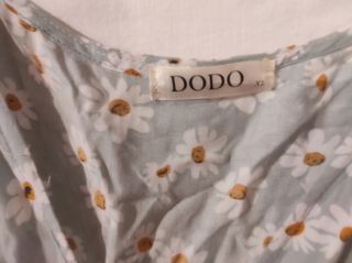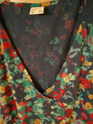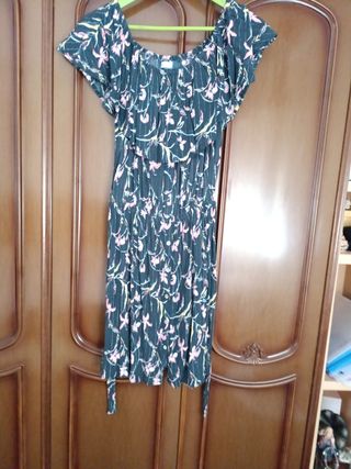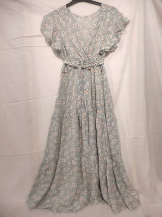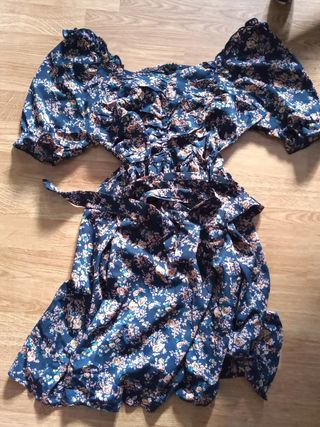 Vestido floreado nuevo con volante en la parte superior , lleva botones a partir de la cintura para abajo y cinturón aunque lo puedes quitar si lo deseas porque lleva solo unas trabillas.Pone talla L, pero yo creo que podría valer para M también.
