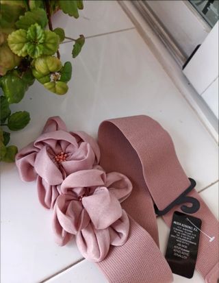 Precioso cinturón de color rosa claro. Ideal para darle un toque elegante a tus atuendos. - Cinturón elástico. - Decoración floral con detalles brillantes. - Perfecto estado.