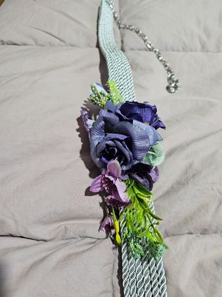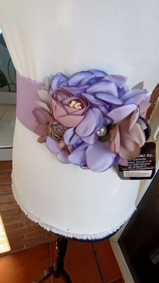 Cinturón elástico con un diseño de flores en tonos lila y morado. Es un accesorio ideal para complementar atuendos de fiesta o eventos especiales. - Adorno central de flores. - Banda elástica para un ajuste cómodo. Medidas: Largo: 67 sin estirar Largo: 115 estirado Ancho: 3,8