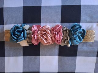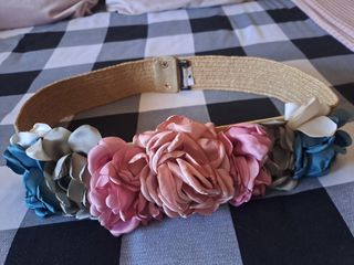 Precioso cinturón con flores de tela. Ideal para añadir un toque elegante a cualquier atuendo. - Diseño floral con tonos rosas y azules. - Base de yute dorada. - Perfecto para vestidos o faldas.