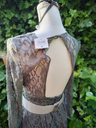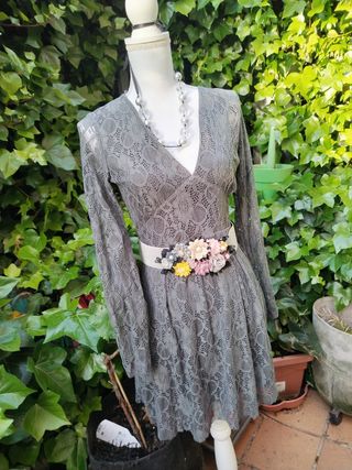 Precioso vestido de verano de encaje gris, ideal para ocasiones especiales. Es de manga larga y tiene un bonito escote en V. Se abrocha en la espalda. Incluye un cinturón de flores. - Talla M - Encaje delicado - Escote en V - Manga larga - Cierre trasero - Con cinturón