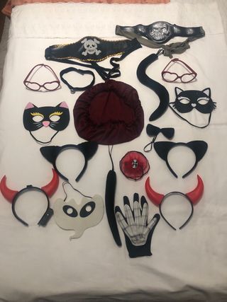 Lote de accesorios variados para celebrar Halloween. - Diadema con cuernos rojos. - Antifaces de gato y calavera. - Cola de gato negra. - Guante esqueleto. - Cinturón pirata. - Gafas de corazón. - Choker con cascabel. - Boina. - Flor roja. - Cola de diablo. - Máscara de fantasma.