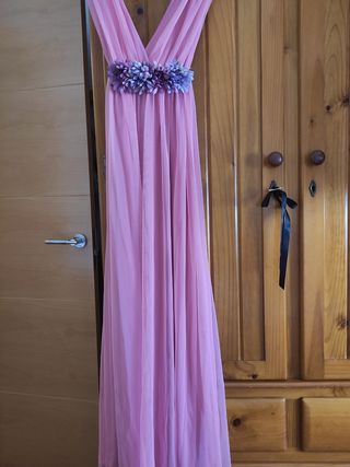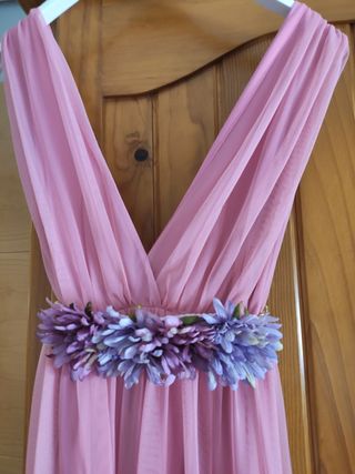 color rosa salmón de tul con forro de punto corte griego y cinturón de flores , una sola puesta