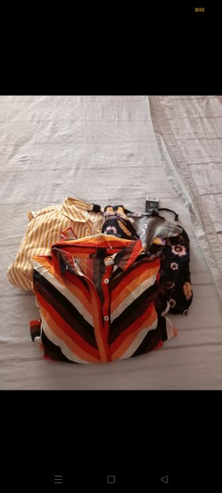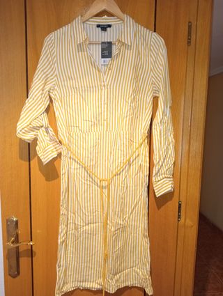 Vestidos camiseros. Uno es amarillo y blanco con su cinturón, la manga larga pero tiene para hacerse más corta. Otro negro con flores igual que el amarillo. Ambos vestidos los botones llegan hasta la cintura. Por último otro de manga corta que se puede hacer una lazada y se habré completo. Los 3 tienen las medidas aproximadas de 38cm de espalda, el negro y amarillo 98cm de contorno de cintura y el naranja 76 cm de contorno de cintura y de largo 105 cm los 3 ( son medidas aproximadas) pero son sueltos y de tela fresca. Los 3 tienen etiqueta (sin usar). Los vendo a 4€ sueltos y los 3 juntos a 10€