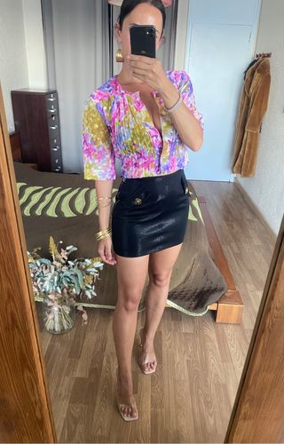 Es una falda pantalón estampada de Zara y de la talla L (aunque también sirve como M). El cinturón se puede ajustar más o menos o incluso quitar. Queda ideal y es súper fresquita y cómoda! Está perfecta, no tiene prácticamente uso.
