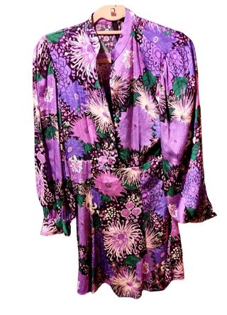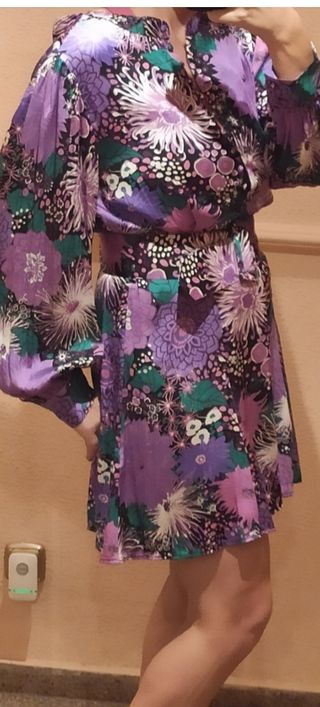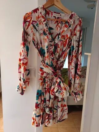 Vestido mini con estampado flores, con mangas camiseras con botones en el pecho y cinturón del mismo material.Sin usar.