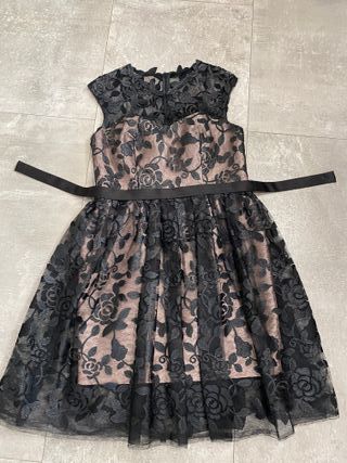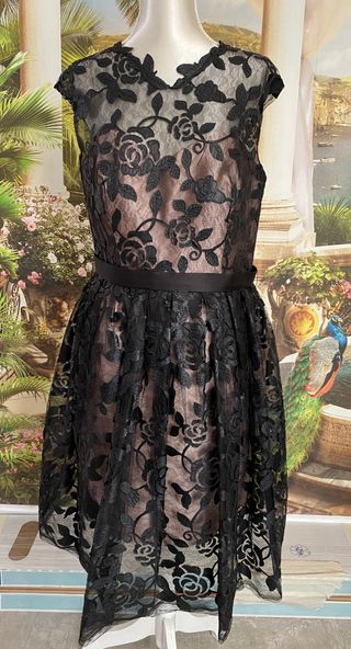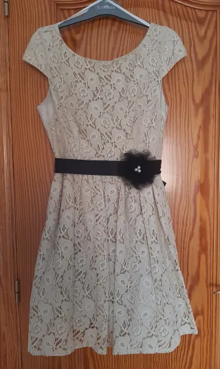Elegante vestido de encaje en color beige, perfecto para ocasiones especiales. Cuenta con un cinturón negro y un detalle floral. - Diseño de encaje floral. - Cinturón negro con detalle de flor. - Manga corta. - Doble forro, uno de ellos con volumen en parte inferior de la falda.