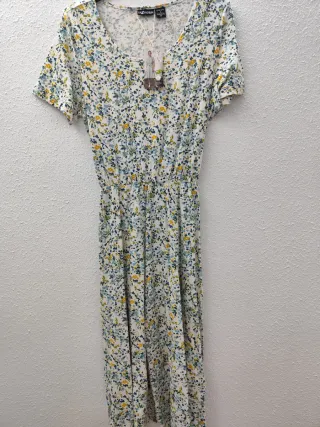 #dresses_anabrotons #size_L_anabrotons #size_m_anabrotons #elcorteingles_anabrotons 🌼 Vestido midi floral de la firma española El Corte Inglés talla 44 equivalente a talla L. Sirve para talla M si le agregas cinturón 🌼 Cruzado, manga corta con abertura y botón joya, escote en pico, cierre con botones joya dorados en delantero 🌼Medidas: 98 cm largo, 40 cm hombros, 51 cm sisa, 47 cm cintura 🌼 Un solo uso, como nuevo, pequeña mancha (ver última foto) 🌼 Composición: 100% viscosa 🌼Precio pagado 149€