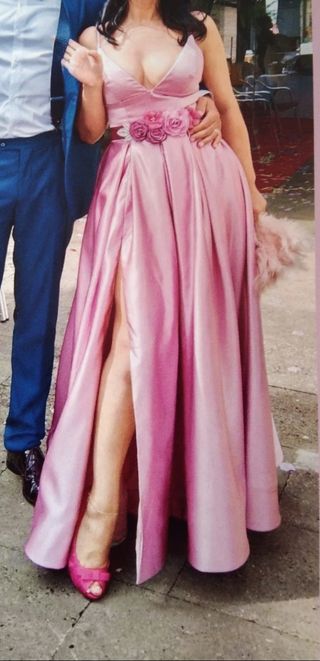 vestido de raso de ceremonia rosa, de tirantes y abertura en la pierna + cinturón de flores