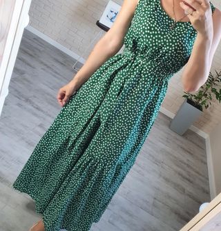 Vestido de tirantes anchos,cuello redondo, de longitud largo hasta el suelo , de color negro con estampado de de flores pequeñas blancas, con cinturilla de goma y lazo a modo de cinturón Talla m amplia Solo disponible en blanco y negro Nuevo sin estrenar