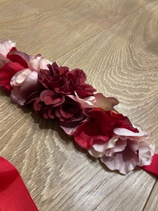 Precioso cinturon loire floral con cintas rojas, ideal para complementar un vestido. - Flores en tonos rosa y burdeos. - Cintas de raso rojas.