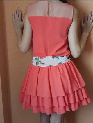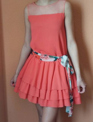 vestido para celebraciones color coral con cinturón de flores .Transparente en zona de escotey espalda. . Falda con volantes y cancán. Usado solo el dia de la ceremonia. Más información por privado. Tienda Girasoles talla 15-16.