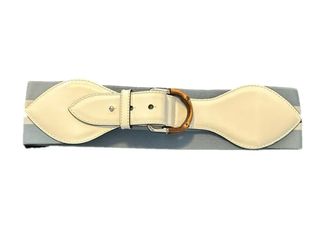 Cinturón Gucci, en piel blanca y elástico azul-blanco-negro. Talla 85.Hebilla de madera clásica de Gucci. Usado solo una vez, ¡estado impecable!