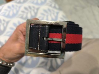 Cinturón Gucci original, modelo clásico con correa verde y roja y hebilla GG metálica. Talla ajustable con varios agujeros. Estado usado con desgaste visible en la piel (ver fotos), pero perfectamente funcional y con estilo icónico de Gucci. Ideal para quienes buscan un cinturón Gucci auténtico a buen precio. ✔ Hebilla GG metálica ✔ Correa verde/rojo icónica ✔ Ajustable – talla estándar Precio: 60