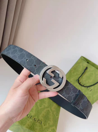 Elegante cinturón de la marca Gucci con el icónico estampado GG. Nuevo, con embalaje, ideal para regalar. - Hebilla plateada con el logo GG entrelazado. - Diseño en tonos negro y gris.