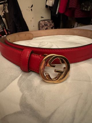 Elegante cinturón de la marca Gucci en color rojo y con una distintiva hebilla dorada. - Diseño clásico con el logo GG entrelazado. - Acabado liso en piel. - Hebilla de metal dorado. Defectos menores en foto Precio negociable. Talla 90/36