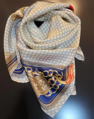 Elegante pañuelo con estampado de cadenas y cinturón. - Diseño con motivos de la marca. - Detalle de cadena dorada. - Acabado con borde azul y dorado.