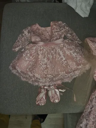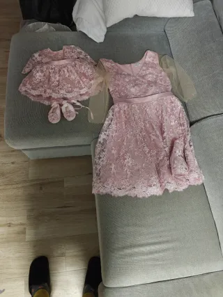 Conjunto de dos vestidos de encaje, uno para bebé y otro para niña, a juego. Incluye también un par de patucos. - Vestido de manga larga para bebé. - Vestido de manga corta con mangas de tul para niña. - Detalle de cinturón de satén. - Adorno de encaje en el bajo.