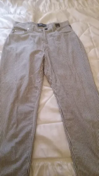 Pantalón vintage Versace Couture(serie limitada)con un diseño de rayas verticales en tonos grises. -El diseño presenta un botón de acero en tono plateado. - Diseño de rayas verticales. - Cintura con trabillas para cinturón y logotipo de la firma marcado. - Código de autenticidad.