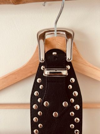 Cinturón ancho con un diseño de tachas plateadas a lo largo de los bordes. - Material: Cuero. - Color: Negro con detalles plateados. - Cierre: Hebilla metálica.