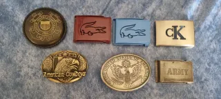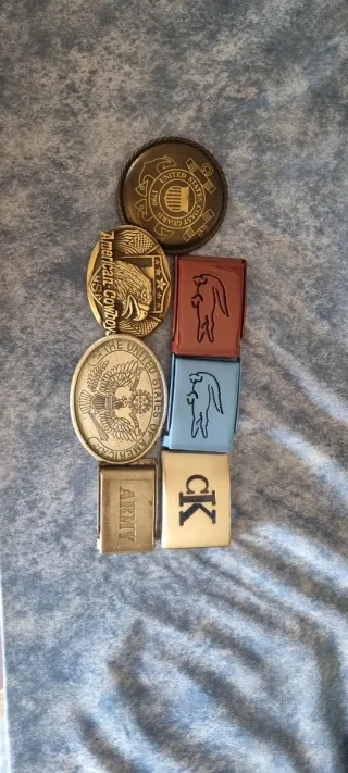 Conjunto de hebillas de cinturón con diseños variados. - Hebilla de la Guardia Costera de EE. UU. (US Coast Guard). - Hebilla con águila The United States of America. - Hebilla American Cowboys. - Hebilla ARMY. - Tres hebillas con diseño de figura estilizada en colores cobre, azul y crema. - Hebilla con iniciales CK en color crema.