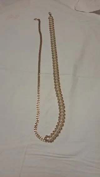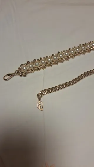 Elegante cinturón con cadena dorada y perlas. Medida largo 95cm - Diseño de cadena entrelazada con perlas. - Cierre de mosquetón. - Adorno en forma de clave de sol.