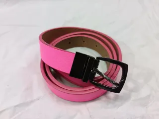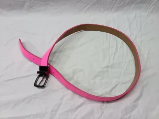 Cinturón de moda en un llamativo color rosa. Cuenta con una hebilla metálica de color negro que le da un toque moderno. Longitud 98cm. Anchura 2'5cm. - Material: Piel sintética. - Hebilla: Metálica, color negro.