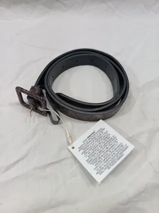 Cinturón de piel con un diseño texturizado que imita la piel de serpiente. - Acabado en tonos marrones y negros. - Hebilla metálica a juego con el diseño. Longitud 96cm. Acho 2 cm.