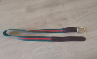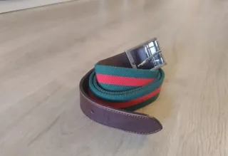 Cinturón con un diseño de rayas verdes y rojas sobre una base de tela, con detalles en piel marrón y hebilla plateada. - Diseño de rayas. - Acabado en piel y elástico. -Talla 95cm. - Precio mercado: 49€