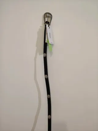 Elegante cinturón negro con detalles metálicos plateados. - Hebilla plateada con diseño. - Adornos circulares plateados a lo largo de la correa.