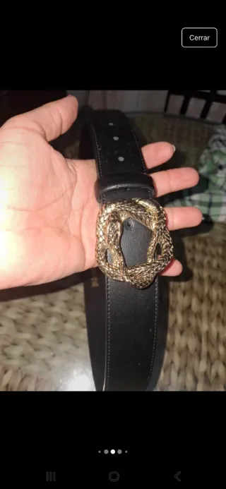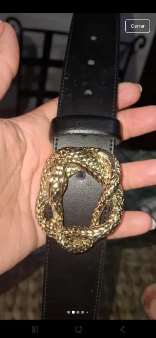 Elegante cinturón de piel con un llamativo diseño. - Hebilla dorada con forma de serpiente. - Detalle de piel negra.