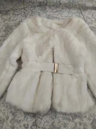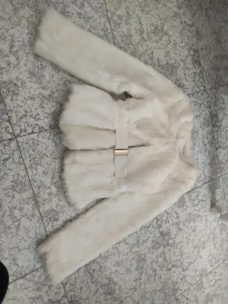 Elegante abrigo de pelo sintético en color blanco. Cuenta con un cinturón a juego que estiliza la figura. - Diseño corto y moderno. - Cierre con corchetes ocultos. - Forro interior suave.