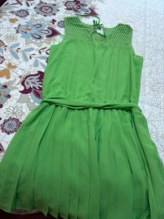 Vestido de un vibrante tono verde, con detalles de crochet en el cuello y una falda con mucho movimiento. - Escote con detalle de crochet. - Cinturón a juego anudado. - Falda con pliegues. - Diseño sin mangas.