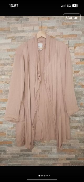 Prenda exterior tipo guardapolvos en tono camel, ideal para añadir un toque elegante a tu atuendo. - Diseño abierto con solapas. - Incluye cinturón para ajustar a la cintura. - Tejido ligero y fluido.