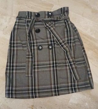 Falda de cuadros con un diseño moderno y favorecedor. - Estampado de cuadros en tonos grises. - Cinturón a juego para ajustar a la cintura. - Cierre de botones en la parte delantera.