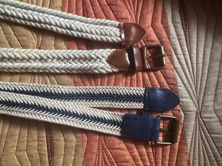 Dos cinturones de tela trenzada con detalles en cuero. y dos tirantes a estrenar. - Un cinturón es de color beige con hebilla metálica y detalles en cuero marrón. - El otro cinturón es beige con una franja central azul marino y detalles en cuero negro.