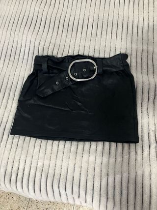 Mini falda de cuero sintético con un diseño moderno y elegante. La cintura alta con cinturón le da un toque chic. - Material: Cuero sintético. - Detalle de cinturón con hebilla metálica. - Cintura alta.