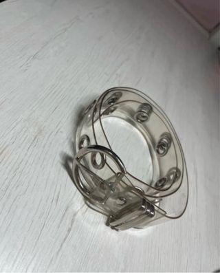 Cinturón transparente con un diseño moderno y versátil. - Material: Plástico transparente. - Cierre: Hebilla metálica. - Diseño: Ojales a lo largo de toda la tira.