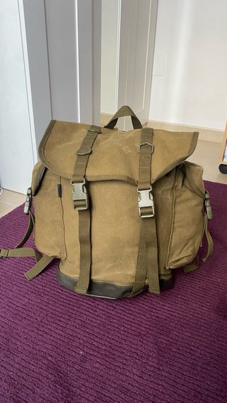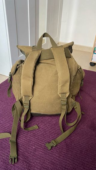 - Mochila ejército alemán vintage. - Material de lona. - Compartimento principal con tapa impermeable. - Base impermeable. - Bolsillos laterales con tapa impermeable. - Cinturón lumbar/cadera.
