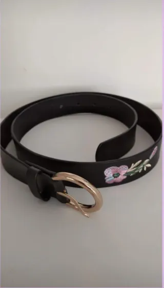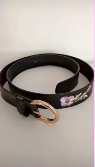 Elegante cinturón para mujer con un diseño único. Muy poco usado, le hice un agujero extra porque me quedaba ancho - Hebilla dorada. - Detalle de flores bordadas en tonos rosas y azules.