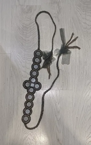 Este cinturón para mujer es un accesorio llamativo y único. - Diseño con múltiples espejos redondos. - Trenzado en la tira principal. - Adornos en los bordes de los espejos.
