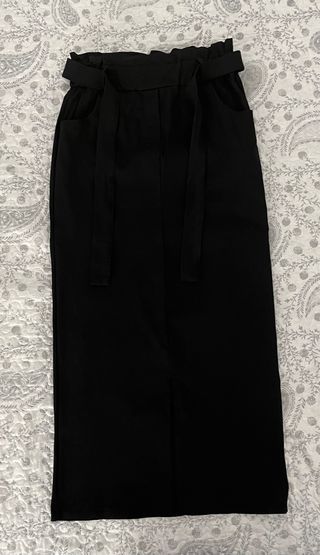 Elegante falda midi negra con cinturón. - Cintura alta con detalle fruncido. - Incluye cinturón a juego. - Bolsillos laterales.
