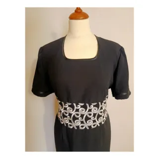 Elegante vestido negro con un llamativo fajín blanco bordado al vestido - Escote cuadrado. - Mangas cortas. - Detalle de fajín con diseño ornamental bordado.