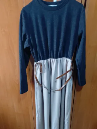 Vestido largo de señora con cinturón. Talla desde una 42 a una 48 Estiliza Abrigadito por arriba Bolsillos en la falda Precio al costo Liquidación - Parte superior en color beige. - Parte inferior en color negro. - Cinturón marrón con hebilla dorada.