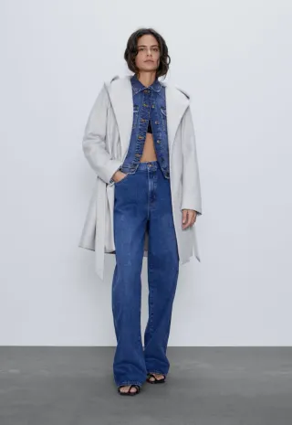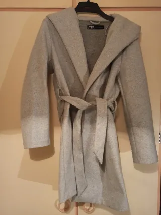 Abrigo de Zara en color gris con diseño moderno y capucha. Sólo una puesta - Cierre con cinturón. - Bolsillos laterales. - Tejido suave al tacto.